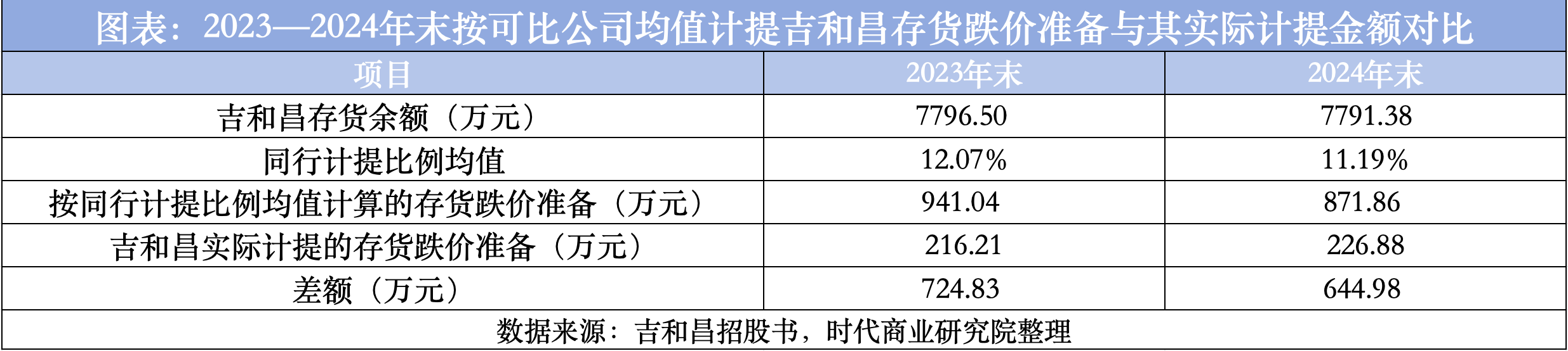 时代商业研究院测算发现,2023—2024年,吉和昌的净利润同比增长额分别为12.43万元、13.34万元。而若根据同行可比公司跌价准备计提比例均值计提,那么同期其存货减值准备将分别增加724.83万元、644.98万元。在其他条件不变的情况下,若根据同行可比公司跌价准备计提比例均值计提,2023—2024年吉和昌能否维持净利润持续增长?这一问题有待解答。