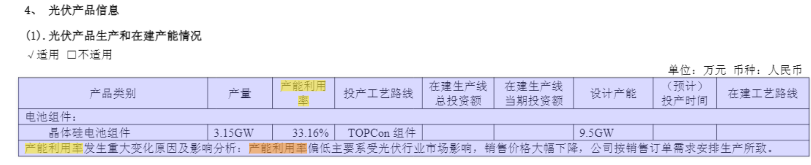 年报显示,2025年国内光伏行业进入深度转型期。受光伏行业周期性影响,公司电池产能已经停产。截至报告期末,公司具备2GW PERC电池产能、7.5GW TOPCon 电池产能以及9.5GW组件产能,相较于2024年年报产能又有所下降。