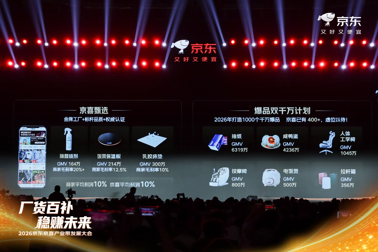 基于对消费人群和趋势品类的精准洞察,京喜在会上启动了“爆品双千万”计划,预计在2026年打造1000个千万级趋势爆品,覆盖全品类,扶持产业带商家厂牌出圈。