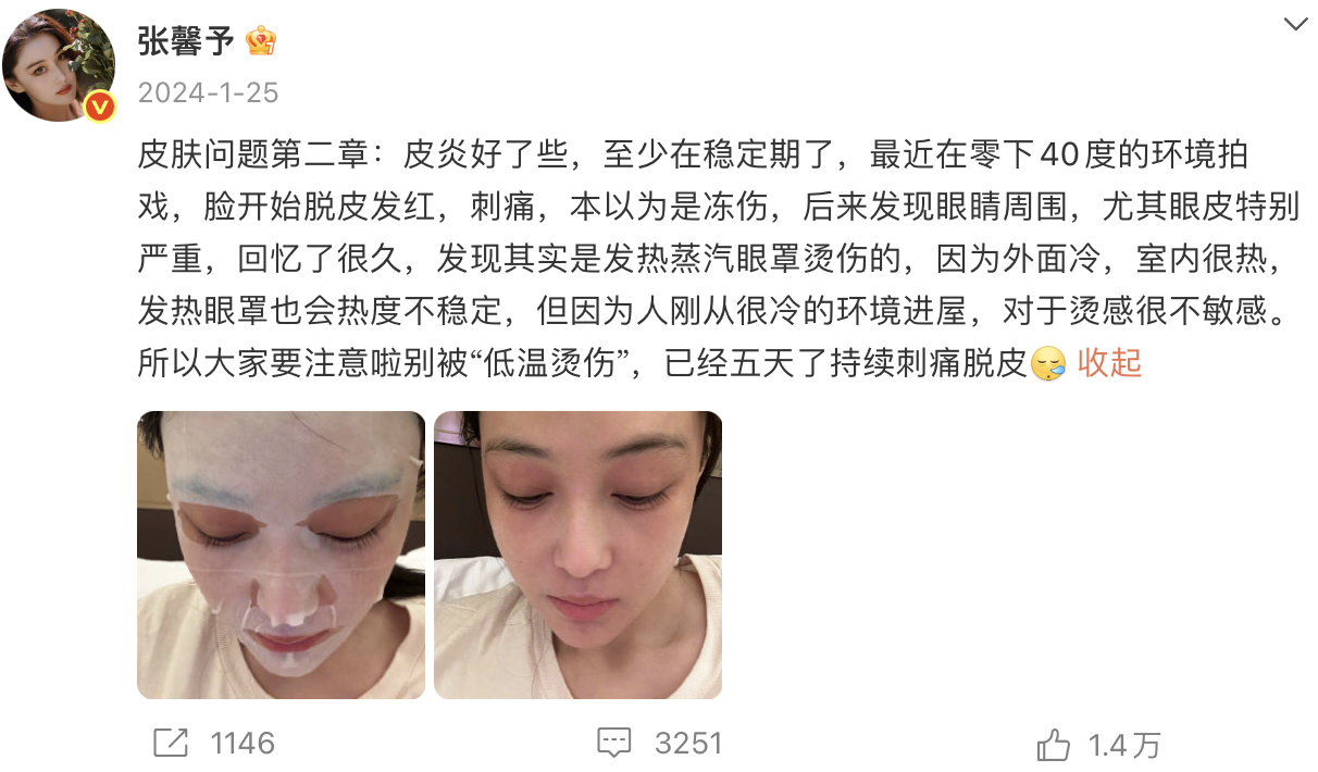 在这条微博的评论区,知名艺人张馨予留言:“我也被烫伤过,这是低温烫伤,一定小心。”《消费者报道》记者翻查张馨予微博发现,她曾于2024年1月发布过自己因使用蒸汽眼罩导致眼部低温烫伤的微博,称出现脱皮、发红、刺痛等症状。