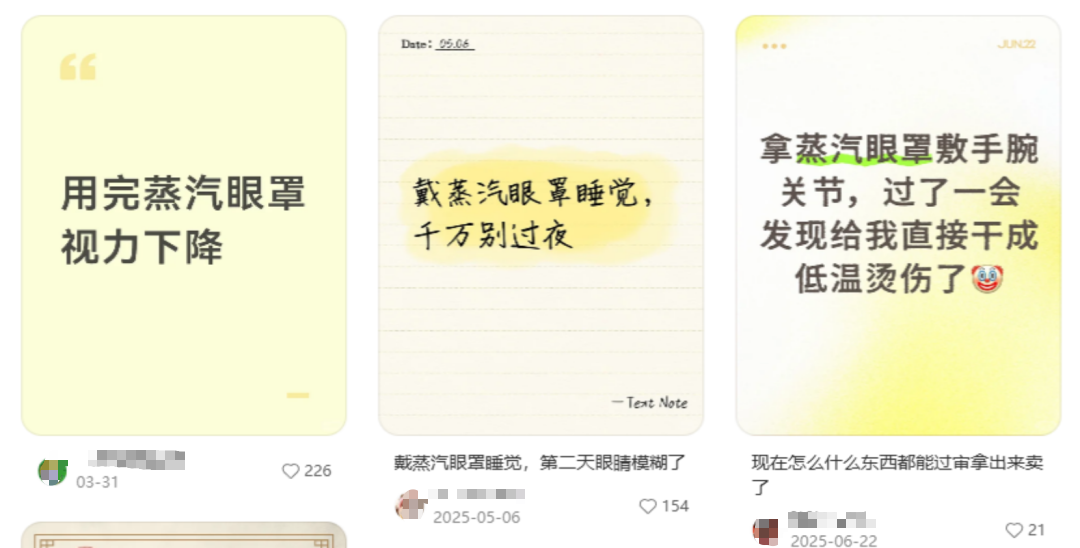 然而,蒸汽眼罩“伤人”事件并不少见,在社区平台上,有不少消费者吐槽自己戴着蒸汽眼罩睡觉后,视力下降、眼睛模糊,还有人拿蒸汽眼罩敷手腕也被烫伤。