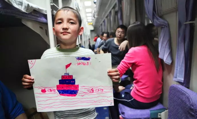 从乌鲁木齐到北京的一路上,祖孙情深,奶奶把亲手烙的馕一块块地掰给孙子吃,孩子画画,奶奶就站在一旁边看边加油鼓励。