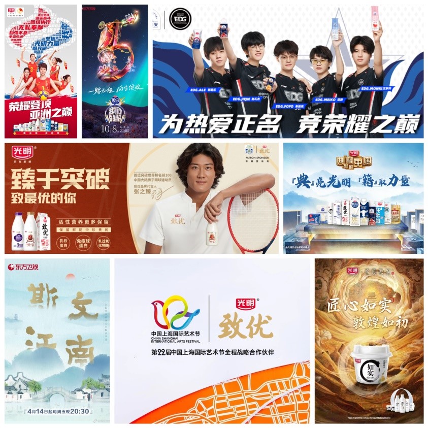 “活动多”是光明乳业的焕新标签:作为英雄联盟官方赛事的战略合作伙伴,独家打造LPL传播墙,成为网红打卡胜地;赞助2023年上海劳力士大师赛,致优代言人“上海小囡”张之臻征服世界赛场;成为“第22届中国上海国际艺术节”的全程战略合作伙伴,汇聚世界各地的精彩作品;冠名呈献“日出-光明 莫奈日出印象”特展、“莫奈&印象派大师展”、“波提切利与文艺复兴”画展等多项艺术展览,让更多人看到、感受艺术之美;冠名《典籍里的中国》《斯文江南》《我们的歌》等多项优质文化音乐节目,向消费者输出文化自信。