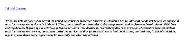 而富途控股曾在2021年年报中指出,富途控股没有持有任何与在中国内地提供证券经纪业务有关的牌照许可证。富途控股也在年报中提及,公司的技术、研发、管理、支持和其他团队很大一部分都在中国内地,公司的大量用户都是中国居民。一旦公司在内地的部分活动被相关监管机构视为在中国境内提供证券业务,如证券经纪服务、投资咨询服务或期货业务,而没能取得相关牌照则意味着面临监管和处罚。
