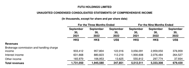 此外,截至2022年9月30日,富途控股的客户总资产为3696亿港元,同比下降12.8%,为近7个季度最低水平。