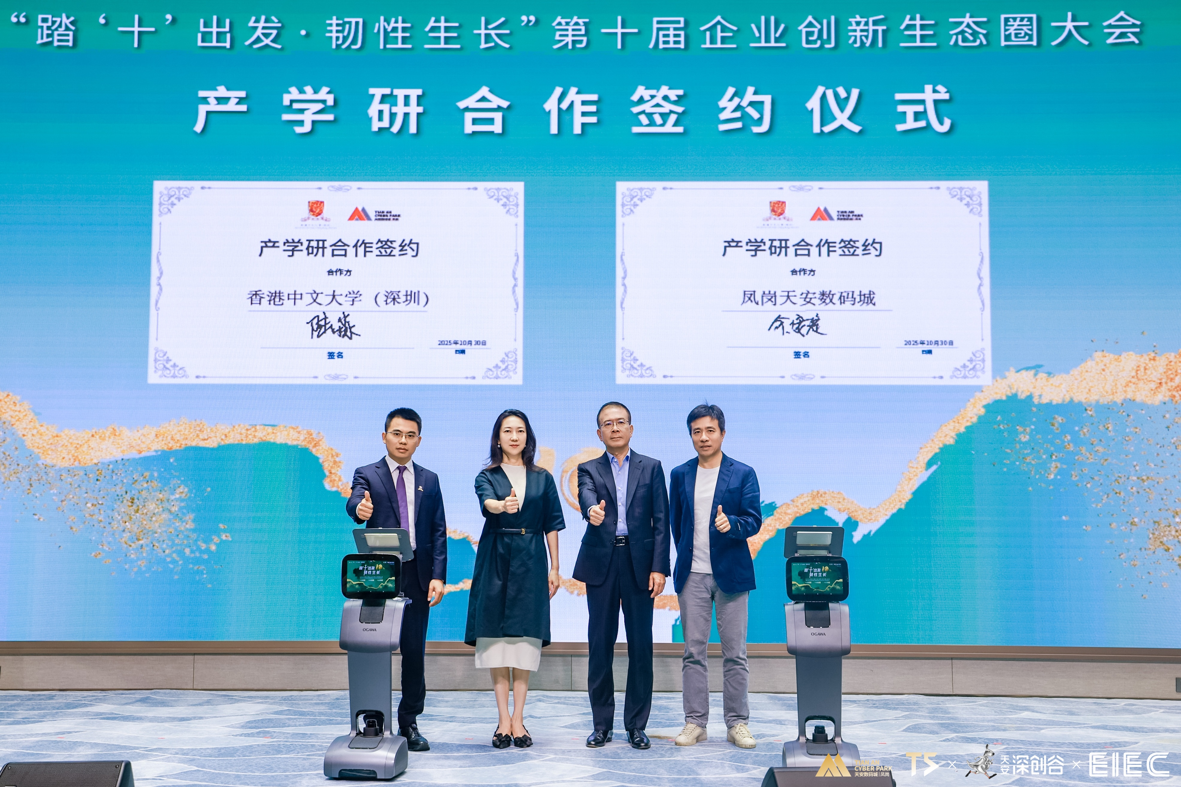 大会现场,凤岗天安数码城与香港中文大学(深圳)签署框架合作协议,共建“AI+智能硬件创新中心”。中心将整合港中深人工智能和智能硬件领域的顶尖科研资源,并整合天安数码城旗下园区的10000+家企业资源,为科研成果向生产力转化提供丰富场景与应用需求。