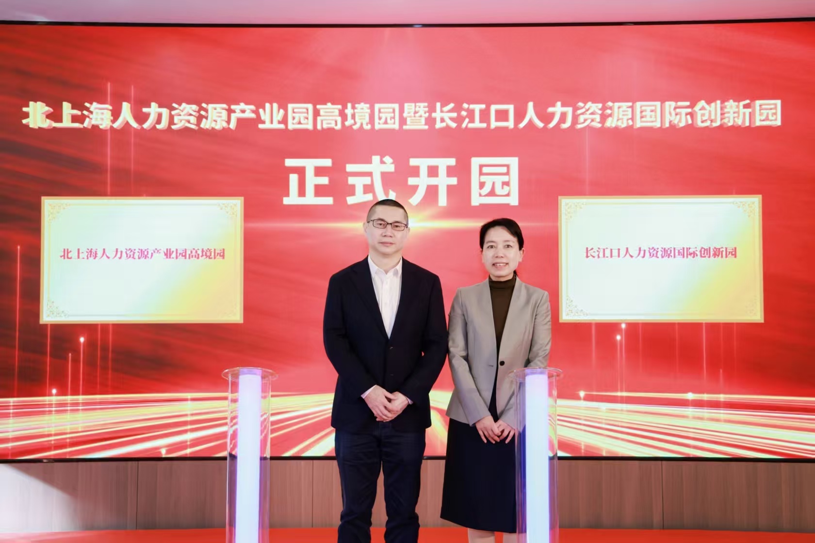 上海市人力资源和社会保障局副局长李炜与宝山区副区长薛飒飒共同为“北上海人力资源产业园(高境园)”、“长江口人力资源国际创新园”揭牌。