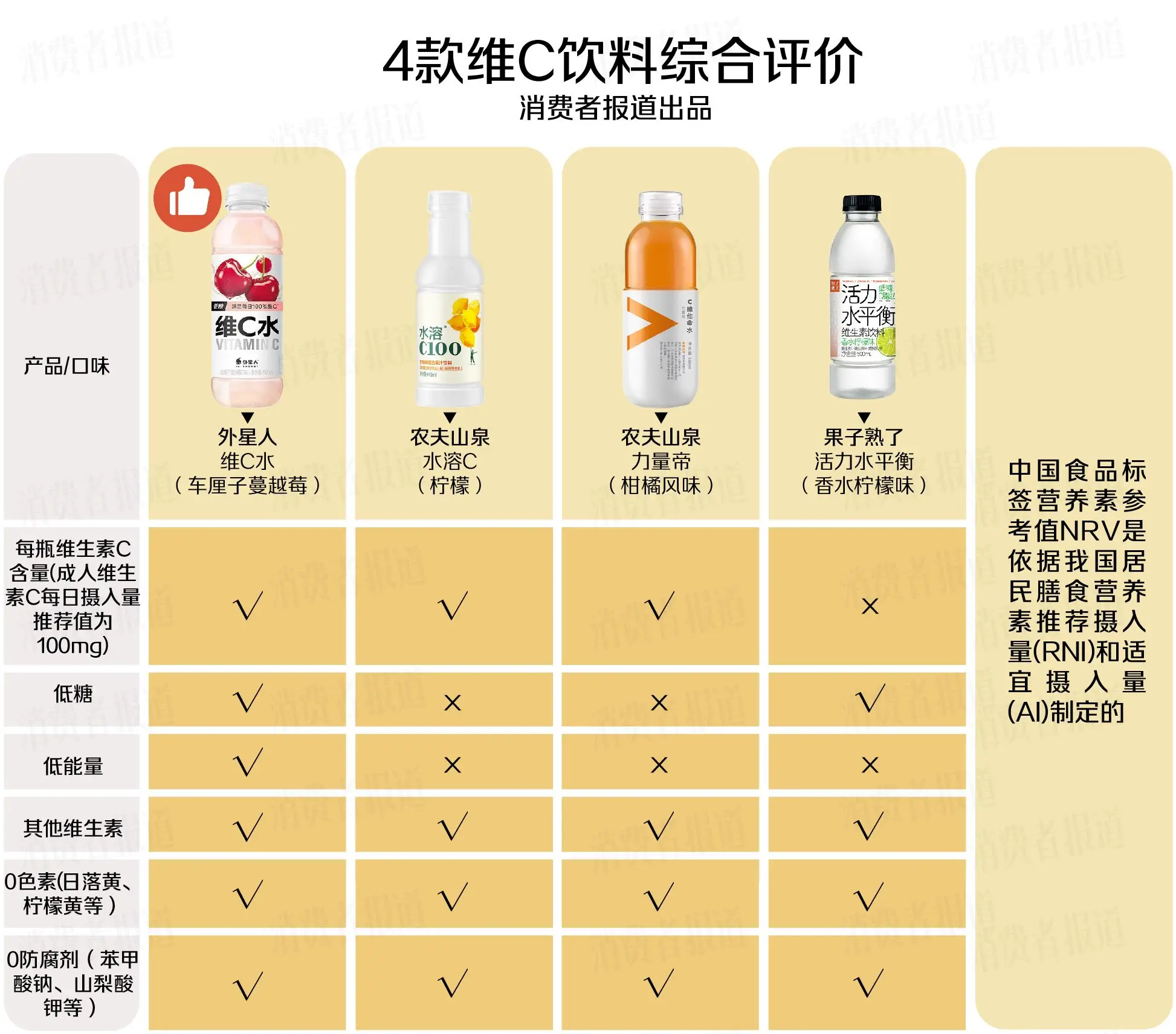 由此来看,目前主流维生素饮料中,外星人维C水是为数不多能够同时满足每日100%维生素C含量适量均衡,且低糖、低能量综合要求的品牌。