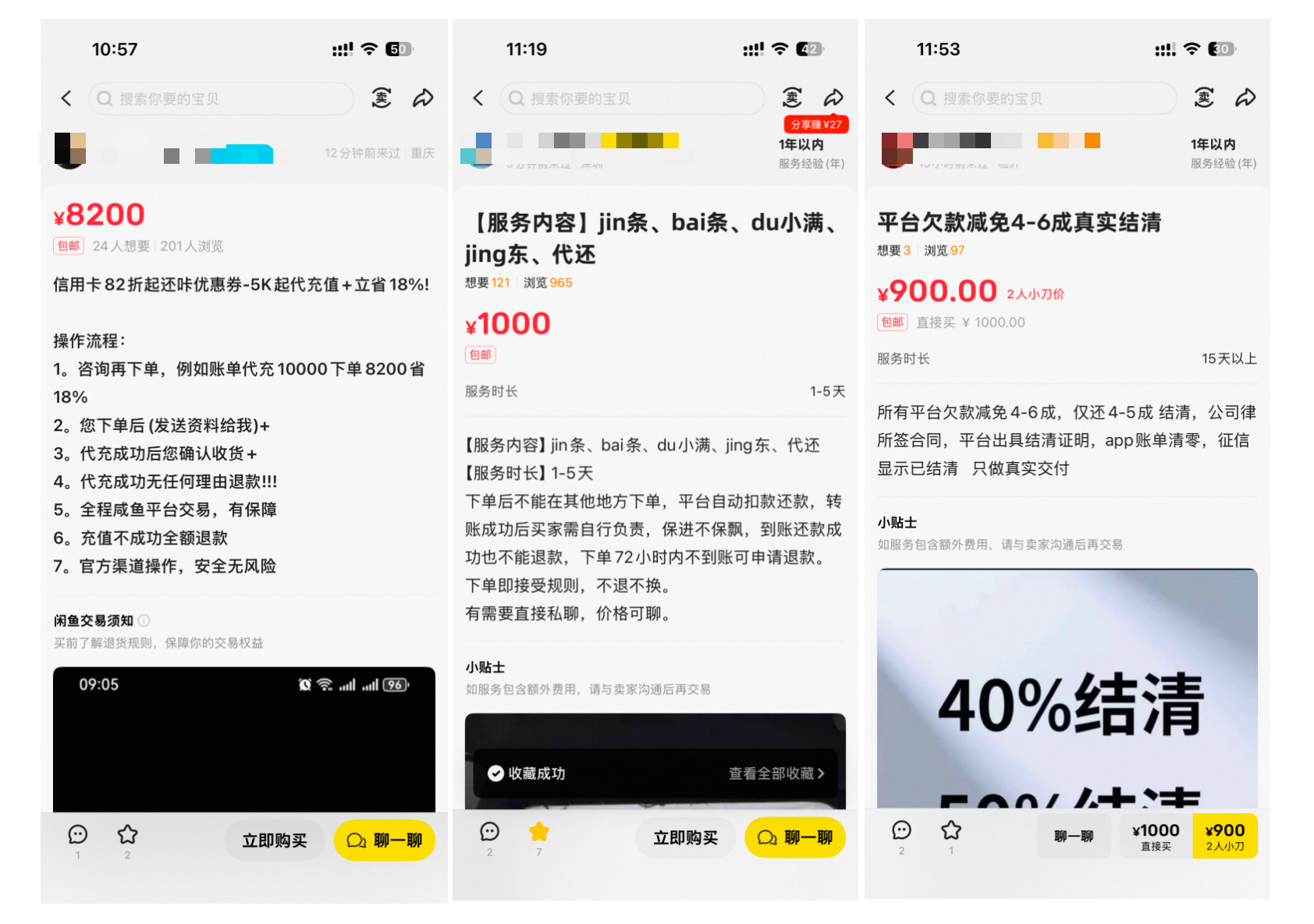 在闲鱼平台,时代周报记者以“债务减免”“还卡优惠”“还款优惠券”等关键词搜索,发现大量提供相关服务的商品链接。有商家明确标注:“所有平台欠款减免4-6成,仅还4-5成结清,公司律所签合同,平台出具结清证明,app账单清零,征信显示已结清,只做真实交付。”