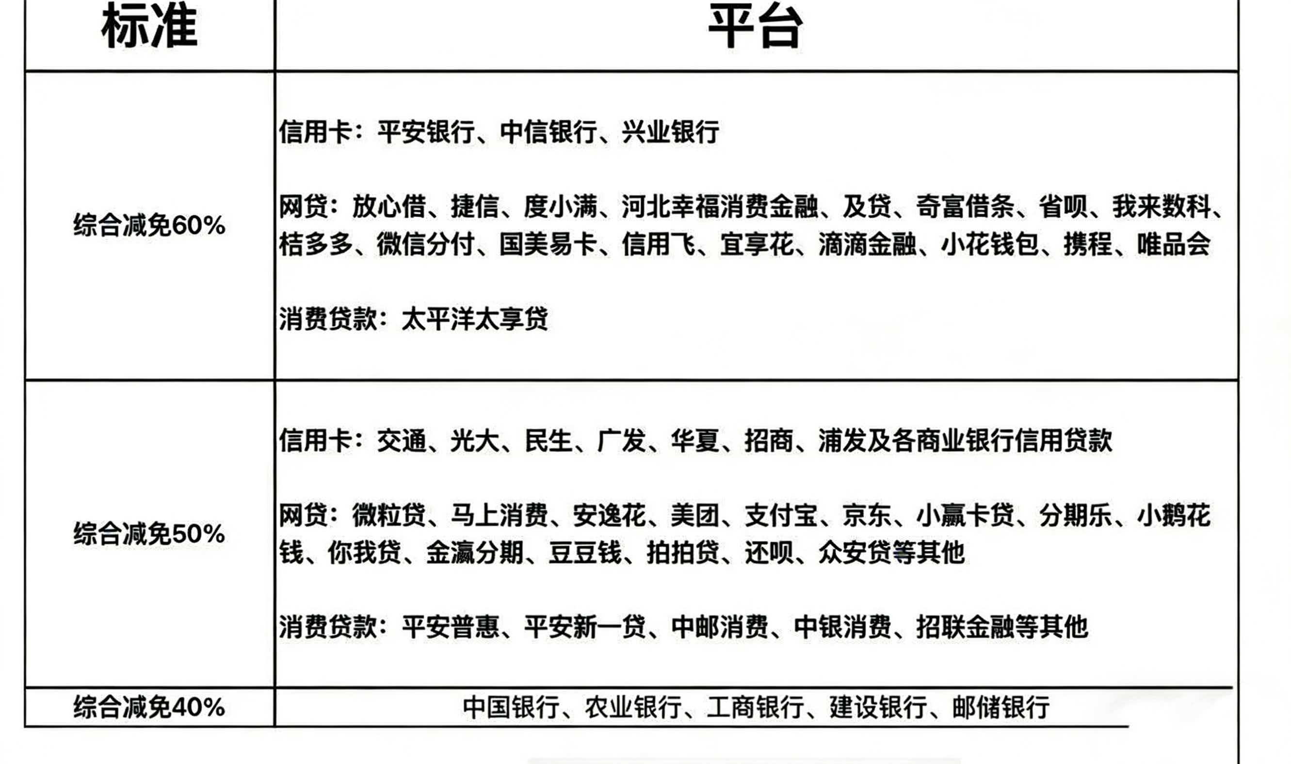 该商家发来的价目表显示,各类债务均可高额减免:中行、农行、工行、建行、邮储银行等五大国有银行信用卡可综合减免40%;多数股份制银行及主流网贷平台(如微粒贷、支付宝、美团、京东等)可减免50%;部分银行及网贷平台甚至可减免60%(如度小满、携程等)。