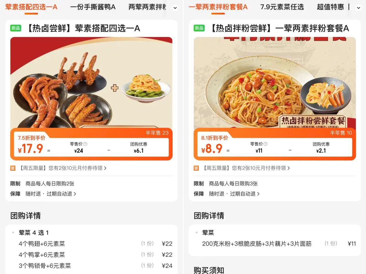 事实上,早在去年10月,煌上煌就试水过热卤套餐,但《消费者报道》记者通过其官方小程序查询发现,该套餐已悄然下架。新品的销售也不甚乐观:在某团购平台上,截至12月19日中午,售价17.9元的煌上煌“【热卤尝鲜】荤素搭配四选一A”套餐仅售出23份,8.9元的“【热卤拌粉尝鲜】一荤两素拌粉套餐A”仅售出10份。