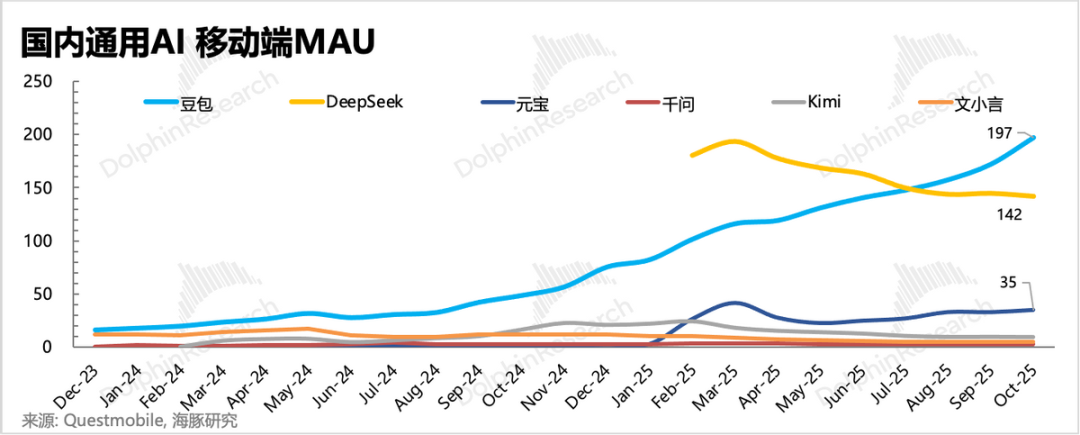 但在具体路径上,字节的方向更侧重于对用户的扩张之上。靠着抖音无限制的流量曝光,豆包的用户规模已然成为毫无疑问的第一名。据海豚研究统计,截至2025年10月,从月活用户数据来看,豆包一骑绝尘占到60%,DeepSeek紧随其后占30%;剩余的10%中,打头的是腾讯旗下的元宝,虽然月活只有豆包的1/6,但是也能排到全国第三的位置。