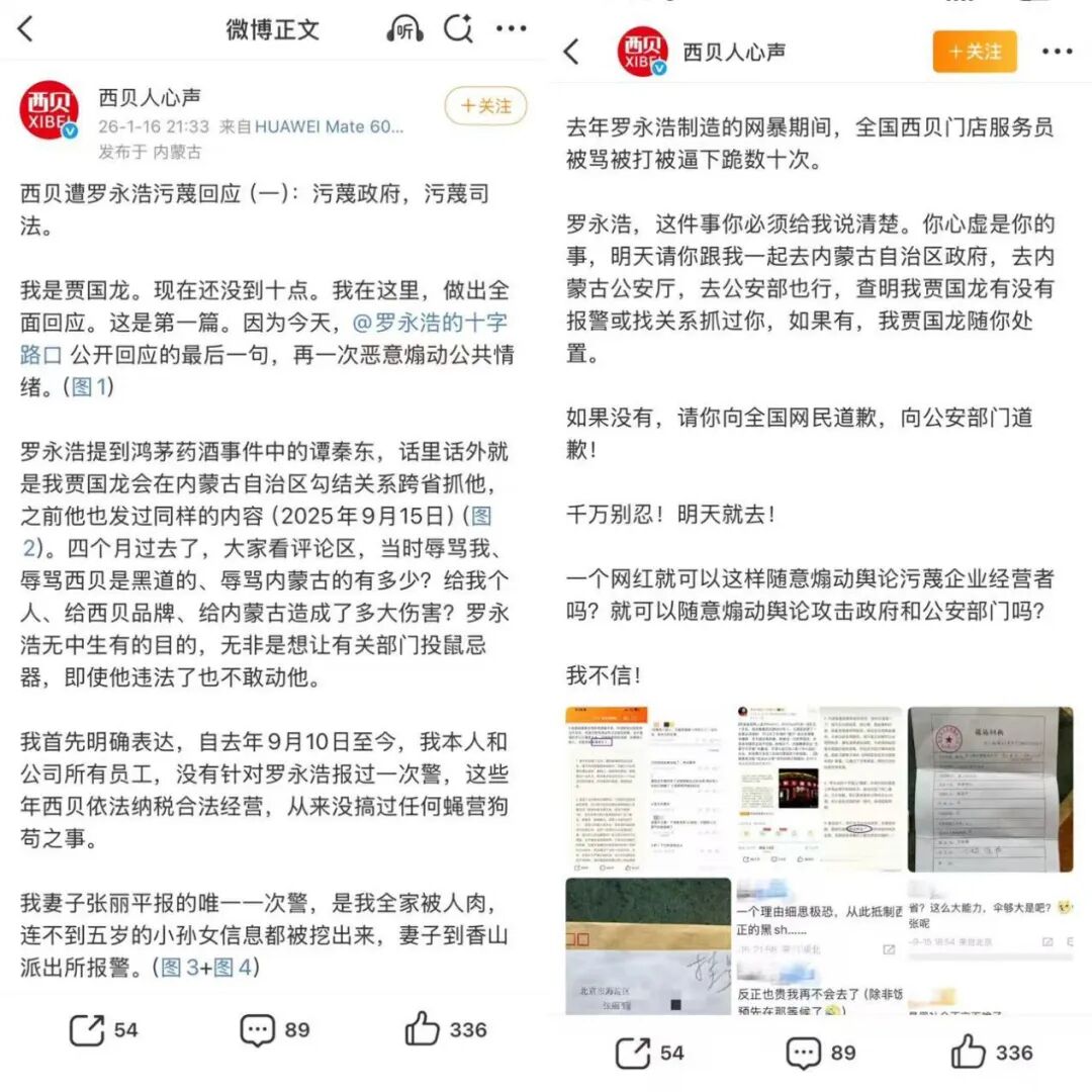 1月16日21:33时,西贝创始人贾国龙通过微博账号“西贝人心声”发布《西贝遭罗永浩污蔑回应(一)》。