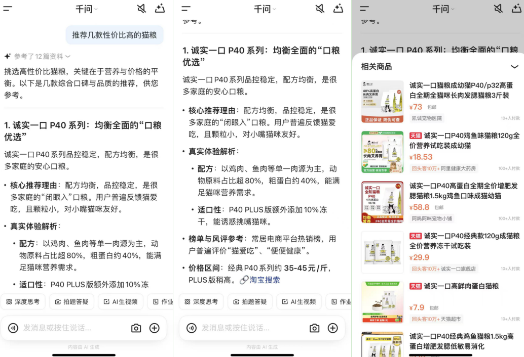 (记者在通义千问提问“推荐几款性价比高的猫粮”,通义千问在回答中列举多款产品,记者点击某款产品下方的“淘宝搜索”后跳转至淘宝电商页面。)