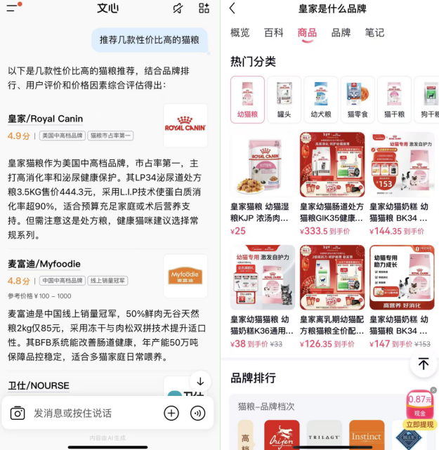 (记者在文心一言提问“推荐几款性价比高的猫粮”,文心一言在回答中列举多款产品,记者点击某款产品的名称后跳转至产品介绍页,用户可在该页跳转至京东电商页面。)