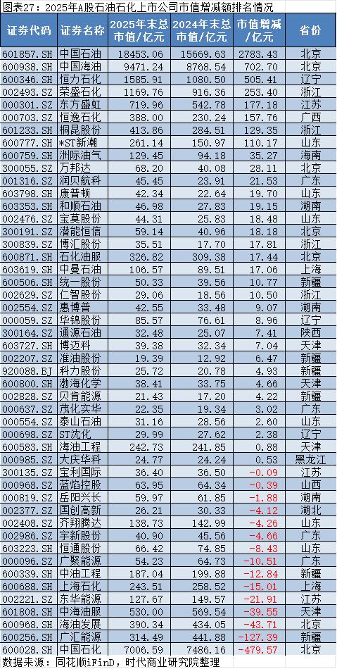 区域分布方面,北京(央企总部集聚)、辽宁、山东、浙江(炼化产业基地集中)等区域上市公司市值增长明显,区域产业布局与资源禀赋高度匹配,形成了从油气开采到炼化加工的全链条产业集群。