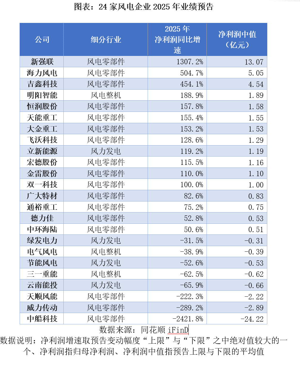 2025年,光伏行业进入深度亏损阶段,9家龙头企业的预亏额合计超过400亿元;同样作为新能源主力赛道,风电这边的风景却大不相同,24家率先披露业绩预告的风电企业,2025年净利润同比增速中位数达91%,其中半数企业翻倍增长。