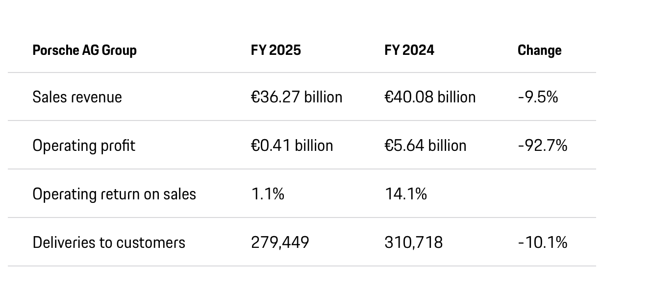 3月11日,保时捷发布2025年财报。财报显示,2025年,保时捷全年营收362.7亿欧元,同比下滑9.5%;营业利润4.1亿欧元,同比下滑92.7%;销售回报率1.1%,2024年这一数据则为14.1%。