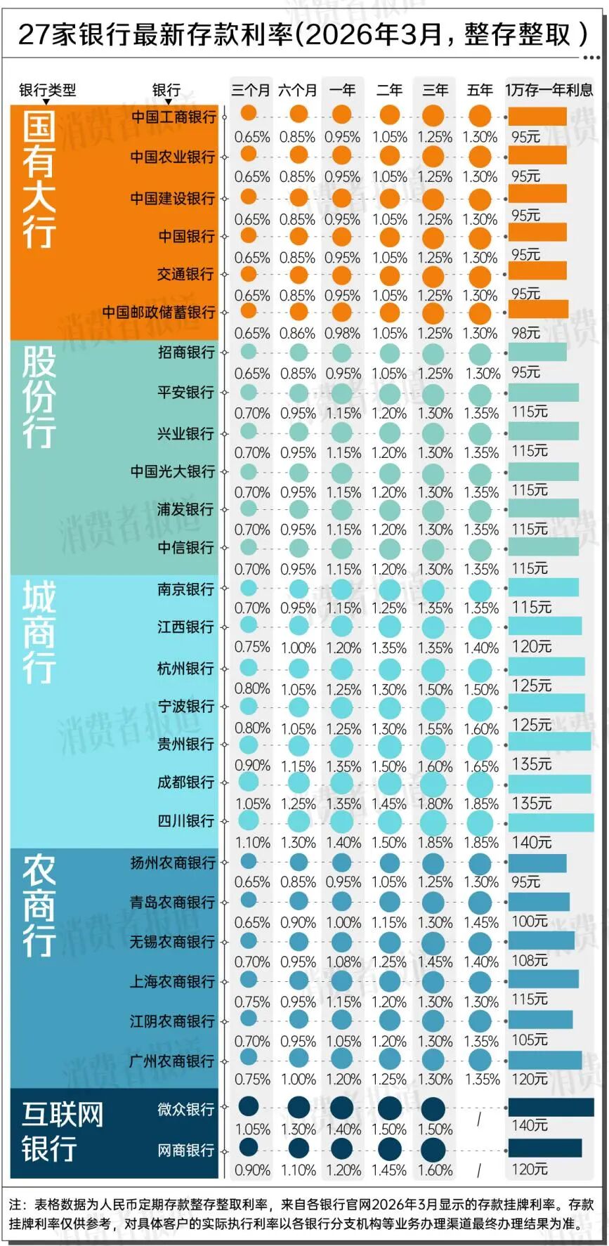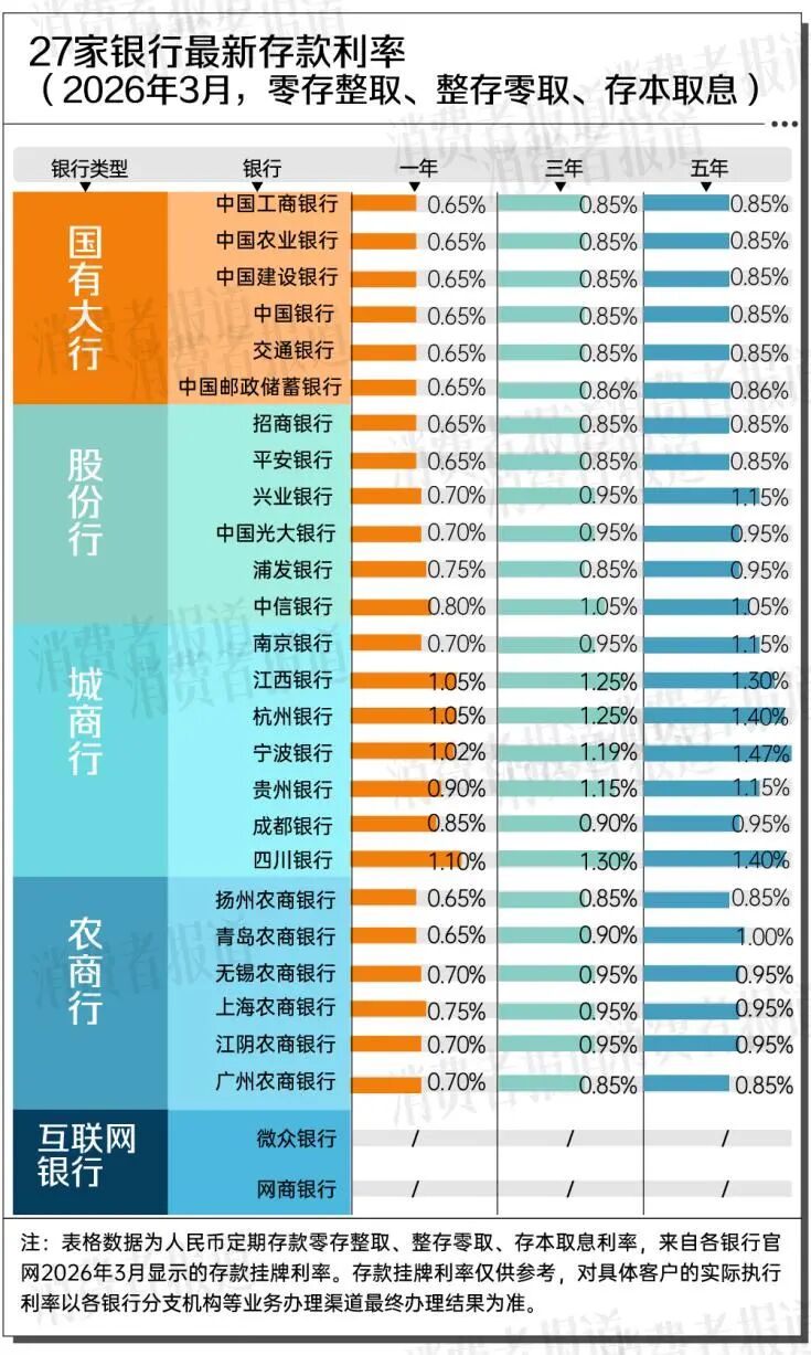 2026年在哪家银行存款更划算?利率最高能到多少?为何部分银行存在利率倒挂现象?存款利率调整节奏是怎么样的?就此,《消费者报道》对27家银行的存款利率进行了汇总与对比,涉及国有大行、股份行、城商行、农商行、互联网银行。