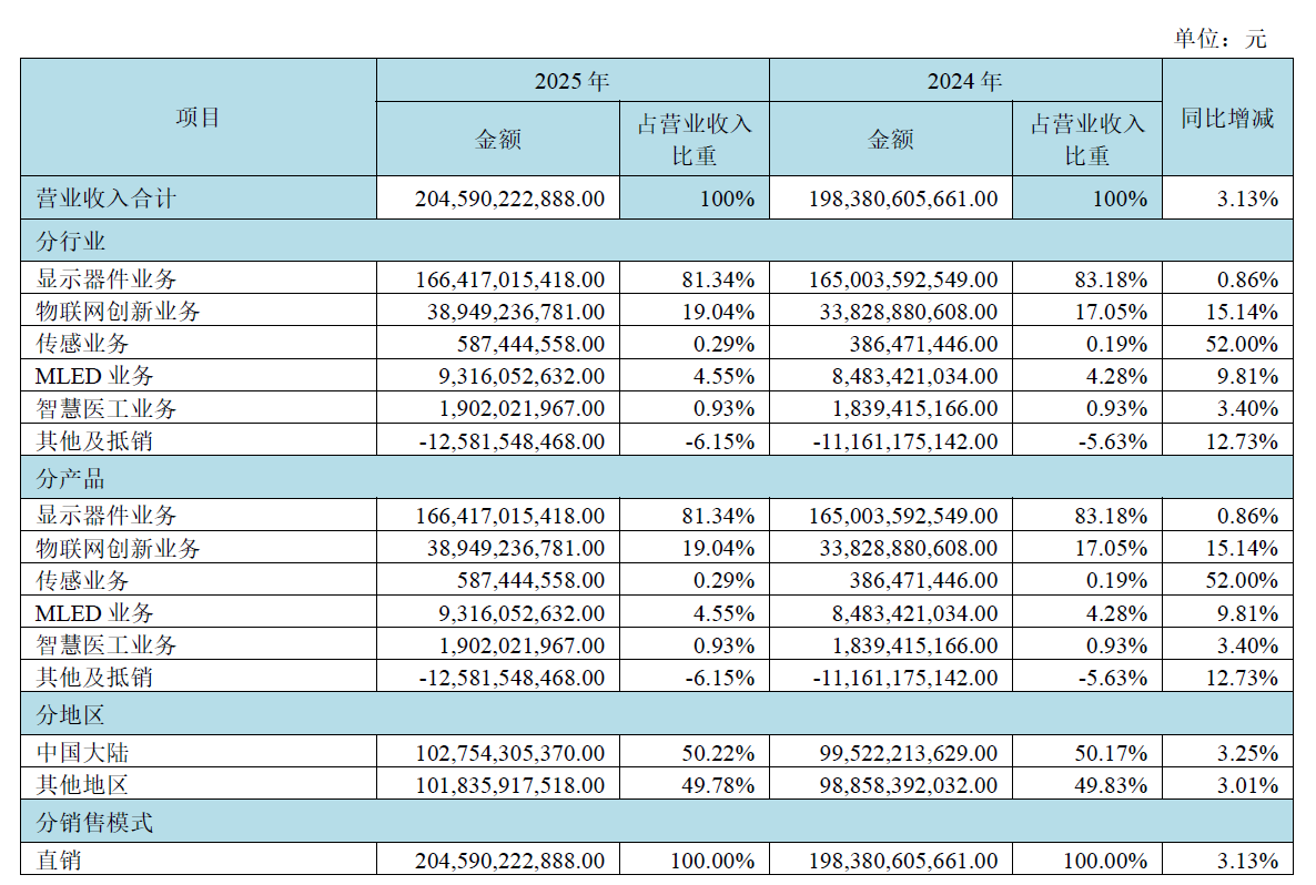 财报显示,京东方物联网创新业务、传感业务、MLED业务、智慧医工业务2025年分别实现营收389.49亿元、5.87亿元、93.16亿元、19.02亿元,同比分别增长15.14%、52.00%、9.81%、3.40%。四大业务合计占营收比为24.81%,而2021年至2024年该占比分别为13.98%、17.15%、23.80%、22.45%。