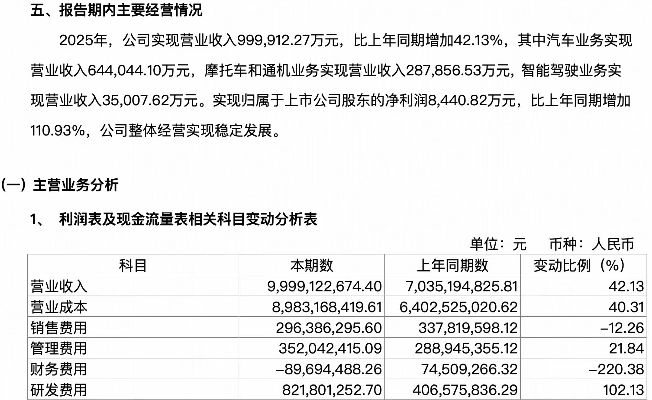 A股上市公司重庆千里科技股份有限公司(以下简称“千里科技”)今日发布2025年年度报告,公司收入、利润双增长,“AI+车”商业化实现突破。报告期内,全年实现营业收入99.99亿元,同比增长42.13%;归母净利润约0.84亿元,同比增长111%。制造业务板块收入达93.19亿元,同比增长37.33%。其中,汽车业务收入达64.40亿元,同比增长52.71%。整车销量同比增长83.93%;摩托车和通机业务收入达28.79亿元,摩托车销量同比增长15.11%;科技业务板块收入达3.50亿元。