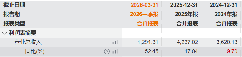 进入2026年,宁德时代主营业务持续增长。一季度营业收入同比增长52.45%,归母净利润同比增长48.52%,扣非归母净利润同比增长52.95%。