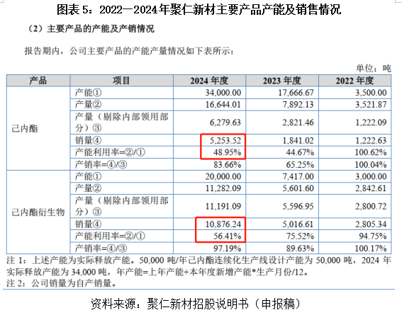本次IPO,聚仁新材拟募资2.92亿元,其中80.5%用于新建4万吨产能。但如图表5所示,2024年该公司己内酯、己内酯衍生物的销量分别为5253.52吨、10876.24吨,产能利用率分别仅为48.95%、56.41%,而新增产能相当于现有产品销量的2.5倍,引发北交所第二轮问询:“大规模扩产的必要性及是否存在产能消化风险?”该公司给出的消化逻辑是——市场空间充足、性价比提升、大客户深度绑定——但上述解释尚需时间验证。