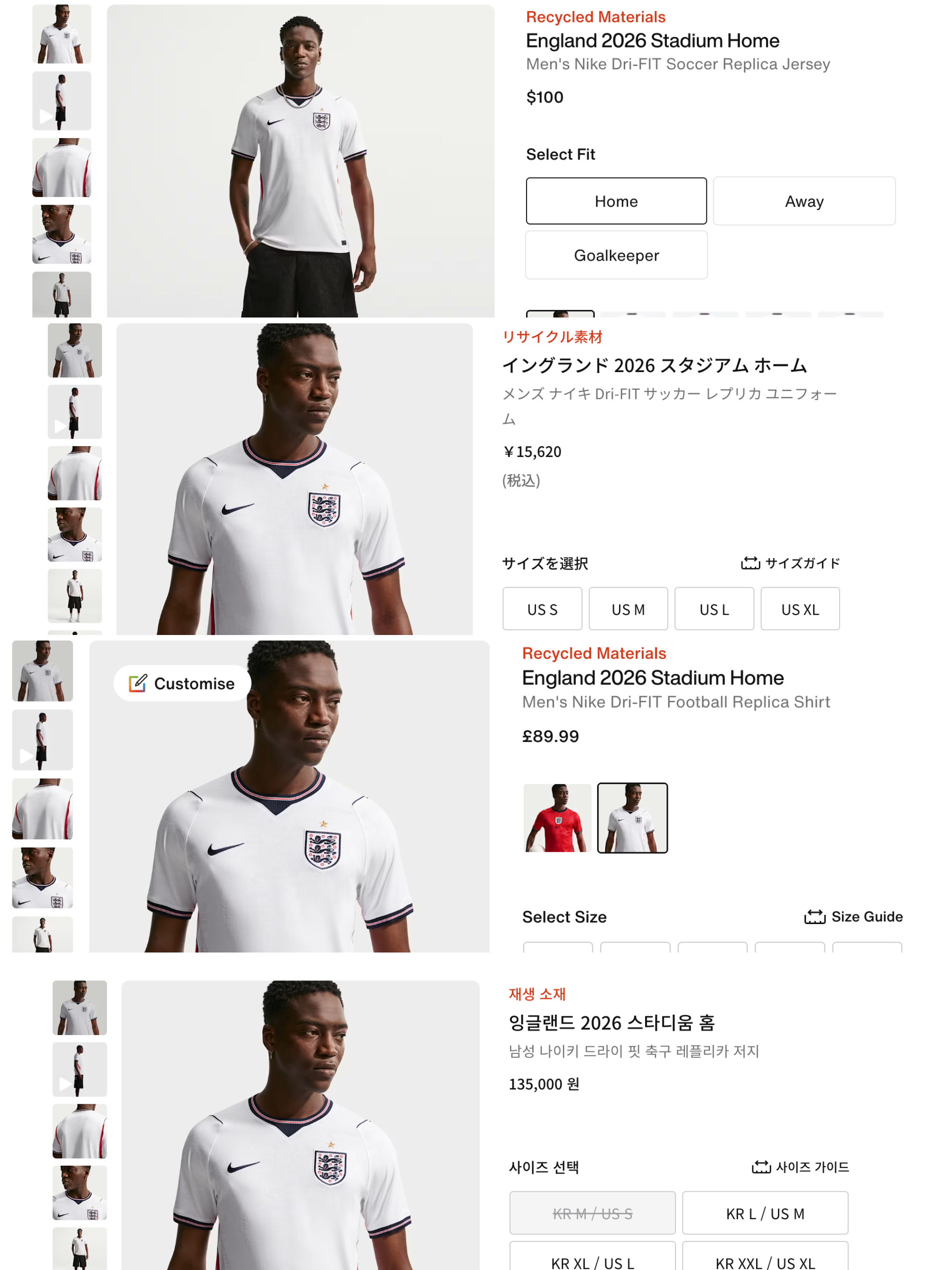 海外市场的定价也不菲。同样以英格兰队球迷版球衣为例,在英国市场售价89.99英镑(约合人民币830元),高于中国市场;美国市场球迷版定价与中国定价相近,达100美元(约合人民币682元);日韩市场则均小幅低于中国市场,日本市场定价15620日元(约合人民币670元),韩国市场则定价13.5万韩元(约合人民币625元)。