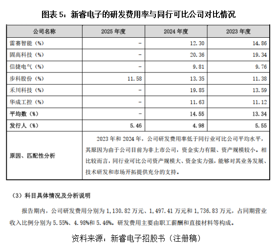 招股书(注册稿)显示,报告期各期(指2023—2025年,下同),新睿电子的研发费用分别为1130.82万元、1497.41万元、1736.83万元,研发费用率维持在4.98%—5.55%,远低于同行可比公司研发费用率的平均数。