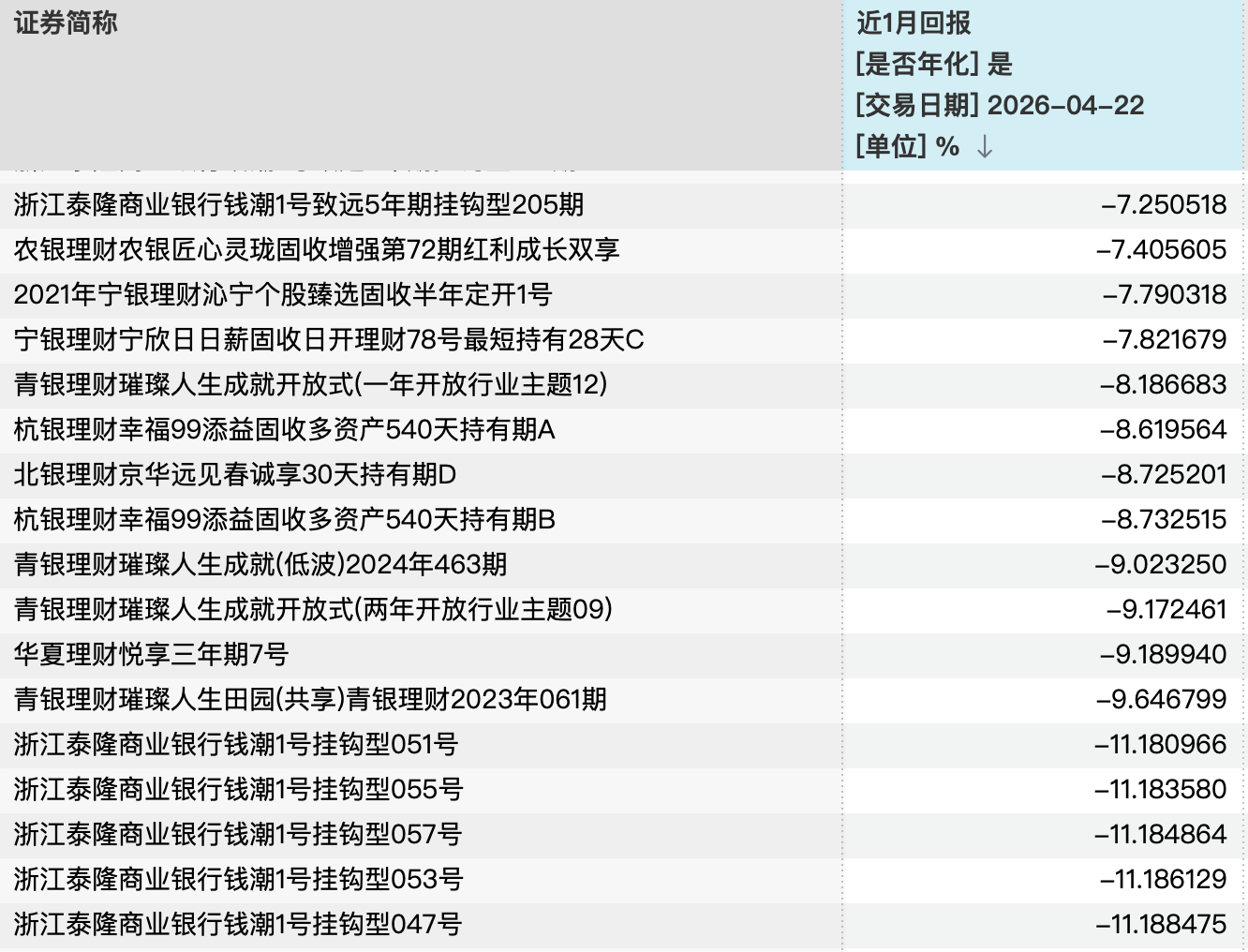 整体来看,截至4月22日,全市场有400余只“固收+”产品近一个月年化回报低于-1%,70多款产品近一个月年化回报低于-5%,其中最低为浙江泰隆商业银行发行的“钱潮1号挂钩型051号”等5款产品,近一个月年化回报约为-11%。