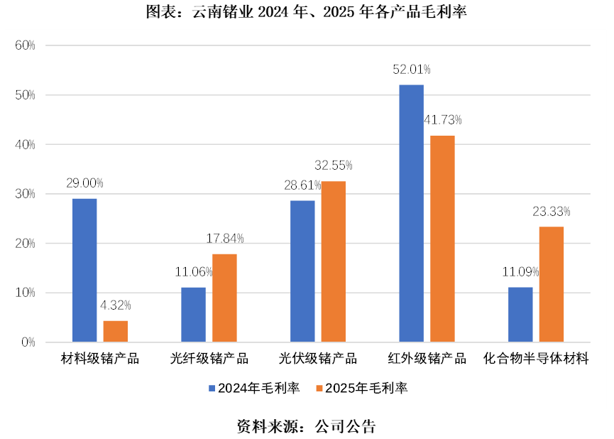 其中,材料级锗产品受成本端冲击最为明显。该产品系锗锭、二氧化锗等上游初级原料,技术含量低、同质化严重,定价权最弱,2025年其毛利率从2024年的29%骤降至4.32%。而材料级锗产品收入占比最高,达34.11%,对整体利润构成显著拖累。