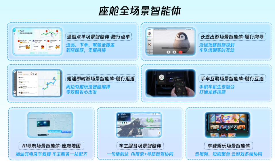最后,在娱乐与服务场景中,车载娱乐场景智能体全面覆盖音乐、新闻、视频、短剧等高频车载内容需求;车主服务场景智能体则聚合了加油、充电、洗车、救援及代泊等出行服务能力。多智能体之间智能协同、联动响应,无需在多应用间频繁切换,实现完整闭环体验