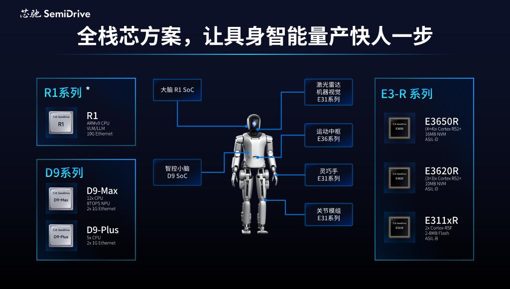 芯驰在本次发布会上首次重磅发布了具身智能全栈解决方案,覆盖“大脑-小脑-躯干-关节”完整架构:全新R1系列产品将作为机器人“计算大脑”,提供强大的AI推理能力;D9-Max作为“智控小脑”,支持EtherCAT实时通信协议,为机器人运动控制提供低延迟、高可靠的主控方案。同时,芯驰现有MCU产品也将同步赋能具身智能,支持激光雷达、机器视觉、运动中枢、灵巧手、关节模组等应用。