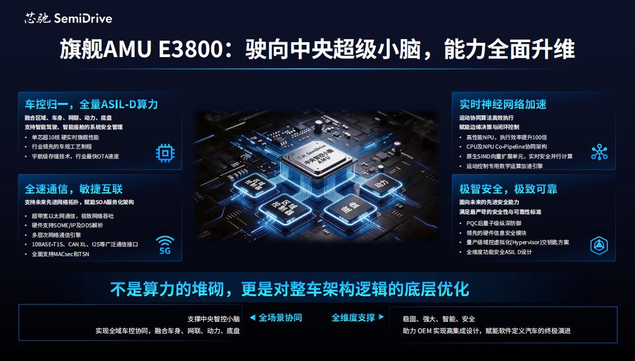 与此同时,芯驰还发布了E3610产品,这颗MCU芯片为IO型区域控制器而设计,配合中央小脑AMU算力基座,实现了对前沿电子电气(E/E)架构的整车级完整覆盖。