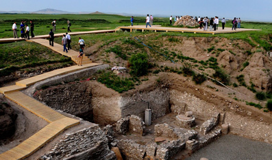 上都位于内蒙古自治区锡林郭勒盟境内的正蓝旗。忽必烈之所以下令在这个位于中国正北方的地方修建这么一座规模宏大,气象万千的都城,原因有两个。其一,这里是元王朝的发祥地。以草根身份一跃而为草原帝国的开创者,一代天骄成吉思汗的事业正是从锡林郭勒草原上起步的:成吉思汗在东乌珠穆沁旗的乌拉盖河畔打过有名的乌鲁辉之战,在西苏尼特旗境内的乌沙堡第一次突破金朝防线,开始了灭金之旅,在太子旗及其以南地区打了著名的野狐岭之战,一举歼灭了金朝30万精锐……直到今天,在锡林郭勒草原上流传着的众多关于成吉思汗的传说,都证明了他和他的子孙与这片面积达20多万平方公里的草原有着深厚的关系。其二,从上都城外流过的那条清澈的小河,它就是一路南来,流经北京的滦河的上游。这个细节说明了一个深刻的因素:蒙元帝国属于草原游牧文明,当它把统治扩张到全中国时,必然要与中原农耕文明发生关系。北京一线乃是农耕文明的边疆地带,而如何让蒙古的游牧文明与中原的农耕文明更好地融合,或者说,如何既让蒙古人保持自己的游牧传统,同时又能对广大农耕地区施行统治,选择一个最适合的地方做首都,是一件重要的事情。正蓝旗既是元王朝的发祥地,且其距北京的直线距离又不到200公里。这两大条件让它有机会胜出:建立首都的地址,就恰到好处地选在了正蓝旗境内。因此,有人认为,上都乃是中原农耕文明与草原游牧文明奇妙结合的产物。