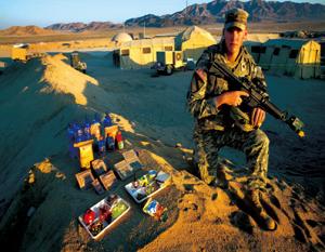 8.美国加州一个军事训练中心,20岁的陆军士兵柯蒂斯和他一天的食物。拍摄当天食物总热量值:4400卡路里。他通常吃双份的自加热野战快餐。拍摄结束后,他将第二次去伊拉克执行任务。