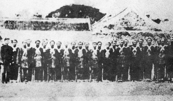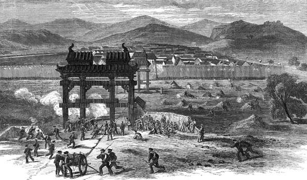 晚清,常胜军在英国洋枪队的帮助下进攻被太平军占领的城市。