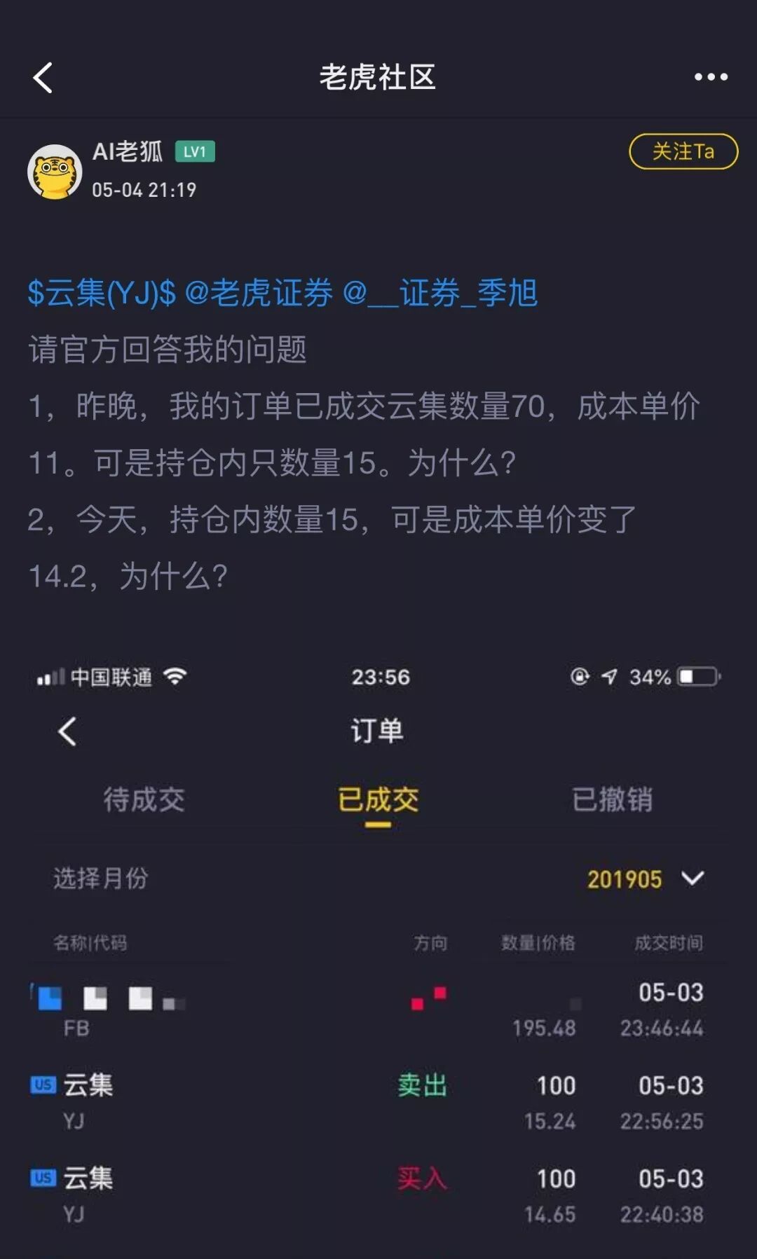 还有投资者账户内的云集股票,在5月3日晚还显示已成交数量为70股,单价11美元。可是持仓只有15股。减少了55股,持仓直接减少78.6%。