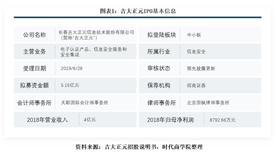 吉大正元成立于1999年2月,经过20年的发展,是国家信息安全行业电子认证领域诸多科研课题及产业化项目的主要承担者之一,主持和参与制定了国家标准9项、密码行业标准26项。截至目前,吉大正元拥有6项发明专利技术及226项软件著作权。2019年6月28日,吉大正元提交了招股说明书,拟登陆中小板。