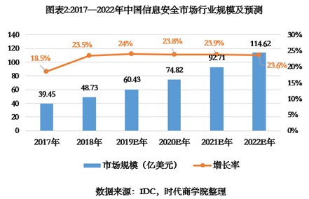 在中国,由于《网络安全法》及相关条例落地、网络安全等级保护2.0制度的实施,行业投入规模不断增加。据IDC数据,2017年,中国信息安全市场的规模为39.45亿美元,同比增长18.5%,保持了快速增长态势;预计到2022年国内市场规模有望达到114.62亿美元,2017—2022年的复合增长率将达到23.78%,未来发展势头良好。
