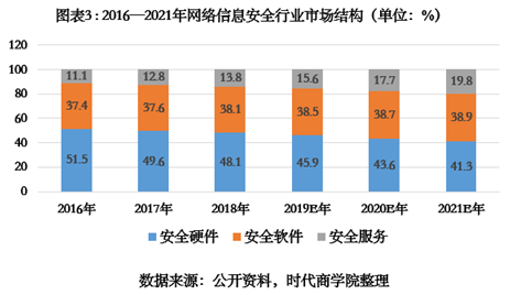 一般而言,网络信息安全产品主要包括安全硬件、安全软件及安全服务。从市场结构来看,目前仍以安全硬件为主,主要集中在网络边界层的防护上。数据显示,2018年,安全硬件市场占比最大,为48.1%,而安全软件、安全服务的市场占比分别为38.1%、13.8%。不过,随着云安全、数据安全、智能制造安全等新兴技术发展,预计到2021年,安全软件和安全服务的市场占比将较安全硬件有大幅提升。