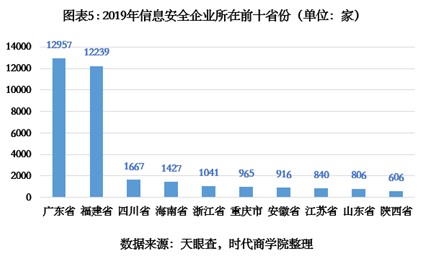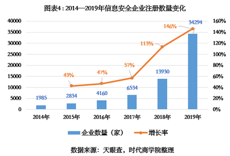 据天眼查显示,2019年,国内信息安全领域的企业注册数量增速达146%,为历史最高水平,总注册企业有34294家。从发展趋势看,2014—2016年,信息安全领域处于起步发展阶段,每年注册企业的增速不足50%;而2018年和2019年,行业迎来爆发式增长,由6534家迅速翻倍至34294家。