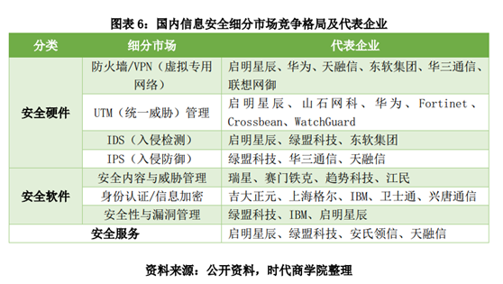 近年来,国内网络信息安全产品市场快速增长,参与厂商众多,各细分产品市场的竞争情况如图表6所示。从竞争格局看,行业细分程度较高,缺乏真正的龙头企业,市场集中度较低。大型厂商占据一定的市场份额,但由于不同的细分市场又存在不同的领先厂商。