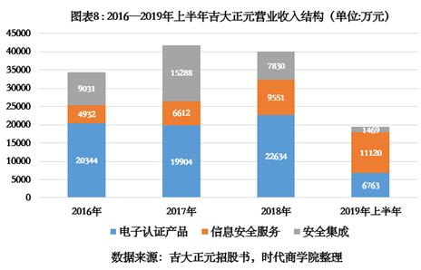 从营业收入结构看,吉大正元的电子认证产品、信息安全服务和安全集成三类业务收入变动趋势并不一致。2016—2018年,电子认证产品是吉大正元经营业务的核心,营业收入占比均在50%左右,而2019年上半年,该项业务的营业收入占比却大幅降低,与之相对的是,信息安全服务业务占比在不断上升。而处境更为尴尬的是安全集成业务,2018年该业务的收入比2017年直接减少了7458万元,近乎腰斩一半,这也是导致吉大正元2018年营业收入下滑的主要原因。