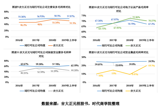 数据显示,2017年和2018年,吉大正元信息安全服务毛利率与同行可比均值分别相差6个百分点和5个百分点,与此前大幅落后20个百分点相比,吉大正元该业务的毛利率确实有所提升,但事实上仍有较大改善空间。同样,由前述分析得知,2019年上半年,该业务的营业收入占比为57.5%,吉大正元表明公司有意将业务重点往该业务倾斜。但回首看,2019年上半年,该业务的毛利率与同行可比公司均值再次相差约18个百分点,招股书中吉大正元并未给出明确解释,可见,吉大正元的新业务转型成效并不理想。