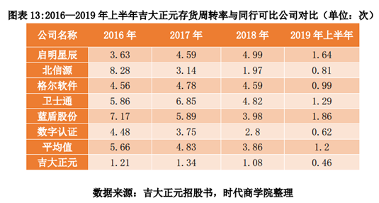 存货周转率不足同行均值1/2。2019年上半年,吉大正元的存货周转率不断下滑,甚至不足同行可比公司均值的1/2,处于较低水平。对于一些实施难度大的项目如安全集成业务等,吉大正元项目运转周期长,导致存货周转率较低。