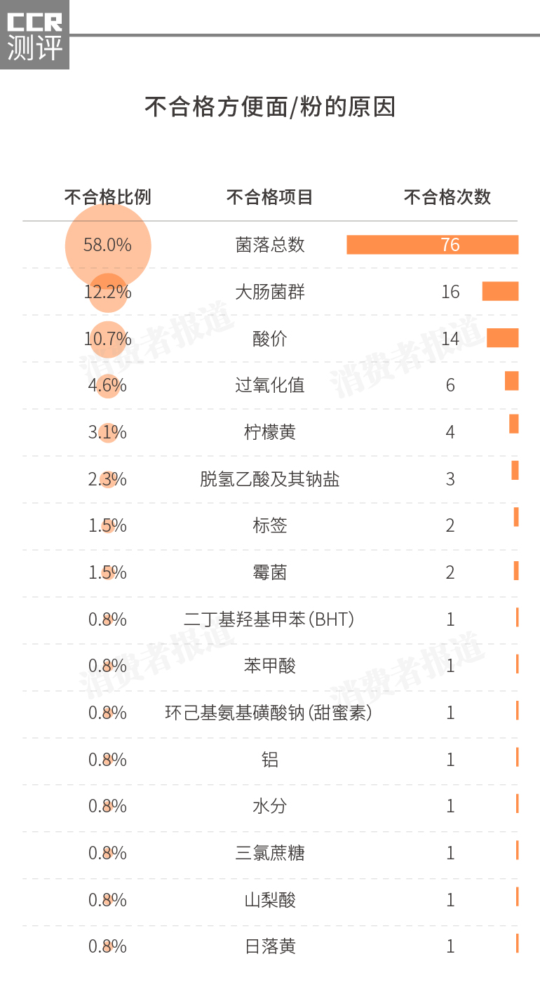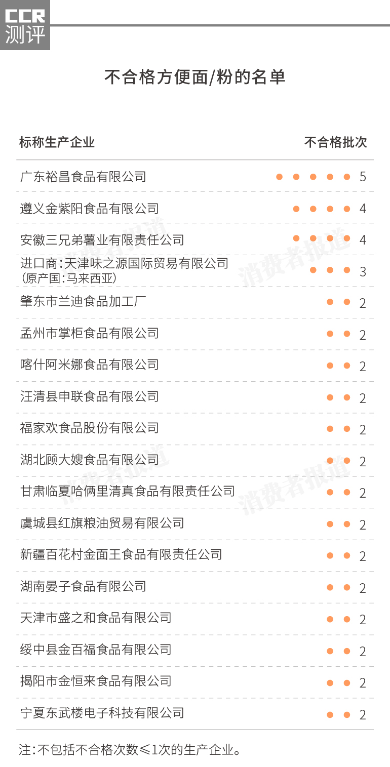 标称由广东裕昌食品有限公司生产的5批次方便面不合格,包括火鸡面(140g/包,2018/8/1)、小金猴西游争霸(脆脆面)(38g/袋,2018/4/20)、小金猴西游争霸(脆脆面)(38g/袋,2018/7/1)、超Q面香辣原汁牛肉面(83g/袋,2018/2/1)、红烧排骨面(油炸型方便面)(46g/袋,2017/7/12),原因涉及菌落总数超标和酸价超标。标称由遵义金紫阳食品有限公司生产的麻辣牛肉味方便面(78g/袋,2018/10/17)、红油辣排骨味方便面(80g/袋,2018/10/17)、麻辣排骨味方便面(78g/袋,2018/10/17)、炖骨拉面香辣牛肉味(方便面)(78g/袋,2015/7/19),不合格原因为菌落总数、大肠菌群或者标签等。标称由安徽三兄弟薯业有限责任公司生产的牛肉脆笋味方便粉丝(110g/桶,2018/3/24)、老坛酸菜方便粉丝(70g/袋,2018/4/2)、正文粉丝(香辣牛肉味)(90g/袋,2018/3/4)、酸辣味方便粉丝(90g/袋,2018/2/1),4批次均为菌落总数不合格。抽检结果还显示,一些市场占有率较高的大型企业产品抽检的合格率较高,比如康师傅、统一、农心、白象、今麦郎、日清、出前一丁等品牌未出现抽检不合格的情况。