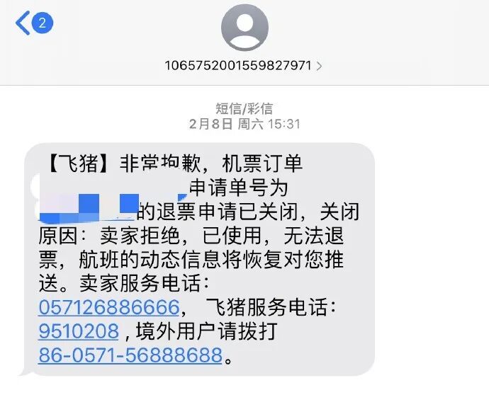 2月8日,范女士收到飞猪方面发来的短信,称退票申请已关闭,“原因为卖家拒绝,已使用,无法退票”,范女士对这样的结果表示不满:“1月23日开始武汉已经‘封城’了,我根本坐不了飞机,怎么机票就被使用了呢?”根据武汉市新型冠状病毒感染的肺炎疫情防控指挥部发布的通告,自2020年1月23日10时起,机场、火车站离汉通道暂时关闭。因此,范女士不能在1月26日使用机票。范女士随后多次拨打飞猪的客服电话,并通过飞猪App中的在线客服反馈问题,两个客服渠道均长时间未接上人工客服,范女士遇到的问题也迟迟未能得到解决。范女士认为:“哪怕航空公司拒绝了我的退票申请,我毕竟是在飞猪买的机票,希望飞猪可以帮忙解决问题。”携程旅行用户王先生也遇到了退票难的问题。2月4日,王先生预定的成都飞往南京的航班被取消,王先生随即在携程旅行App上申请退票。虽然航空公司已经批准了退票申请,但是等待多日后王先生订单的退款进度一直停留在待退款环节。不过,截止至《消费者报道》发稿前,王先生表示终于收到相应的退款。