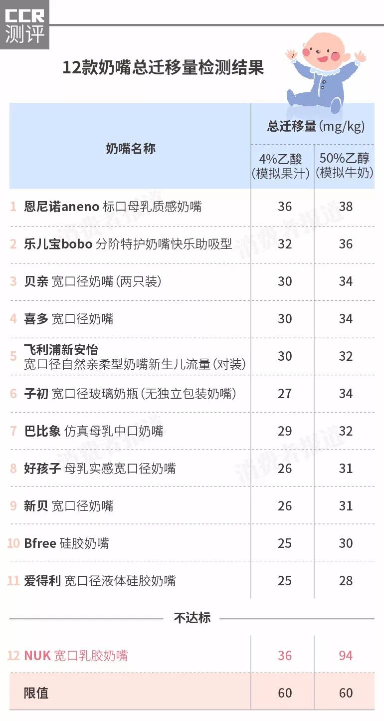 [ccr测评]12款奶嘴安全测试:整体安全可用,但NUK奶嘴总迁移量超标1.5倍!