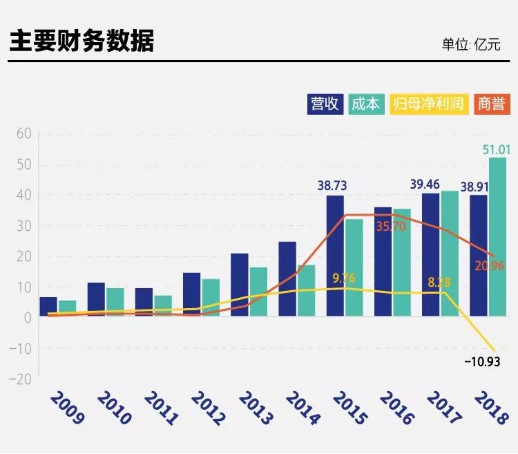 2015年至2018年,华谊兄弟的营业收入分别为38.73亿元、35.03亿元、39.46亿元、38.91亿元,可以说几乎没涨过。但是营业成本却还延续快速增长势头,由2015年的31.12亿元增长至2018年的51.01亿元,平均年增长率达到18.09%。而相对的归母净利润则由2015年的9.76亿元直接降到了2018年的-10.93亿元。